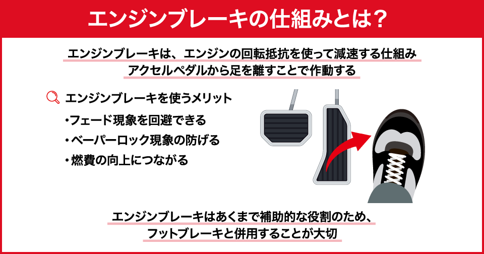 フットブレーキやハンドブレーキとは異なる仕組みで減速するため、それぞれの特徴を理解して使い分けることが大切です。