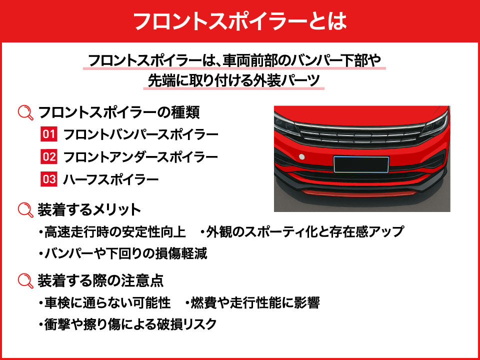 フロントスポイラーは、車両前部のバンパー下部や先端に取り付ける外装パーツです。