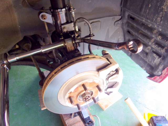 アッパーマウントのナットを緩めたら、ロアブラケットのボルトとナット(スタビライザーやブレーキホースのボルトなども)を外します。