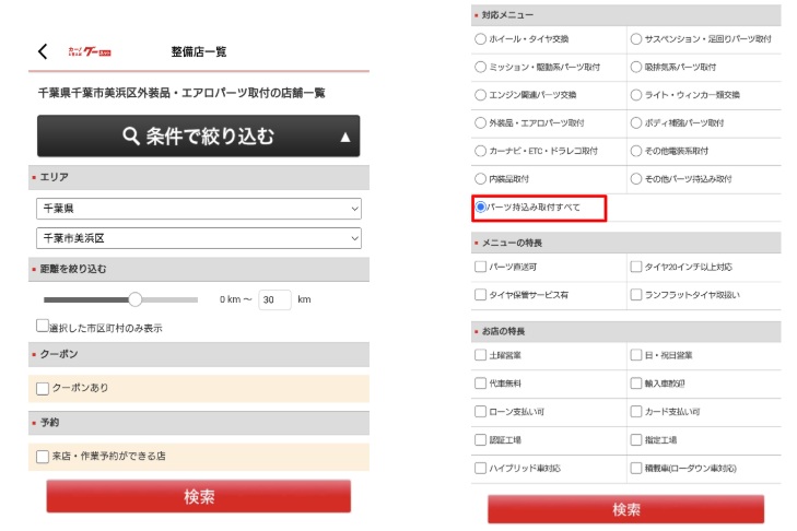 表示された一覧から、さらに選択した市区町村からの距離や来店・作業予約が可能か、パーツ直送が可能か、土曜や日曜・祝日に営業しているか、などより詳細な条件で絞込検索をすることもできるから、自分のスケジュールなどに合わせて取り付けが頼めて便利です。