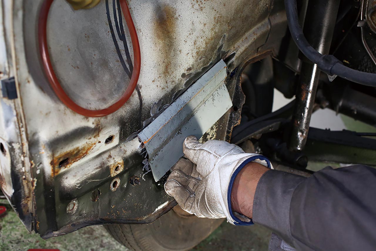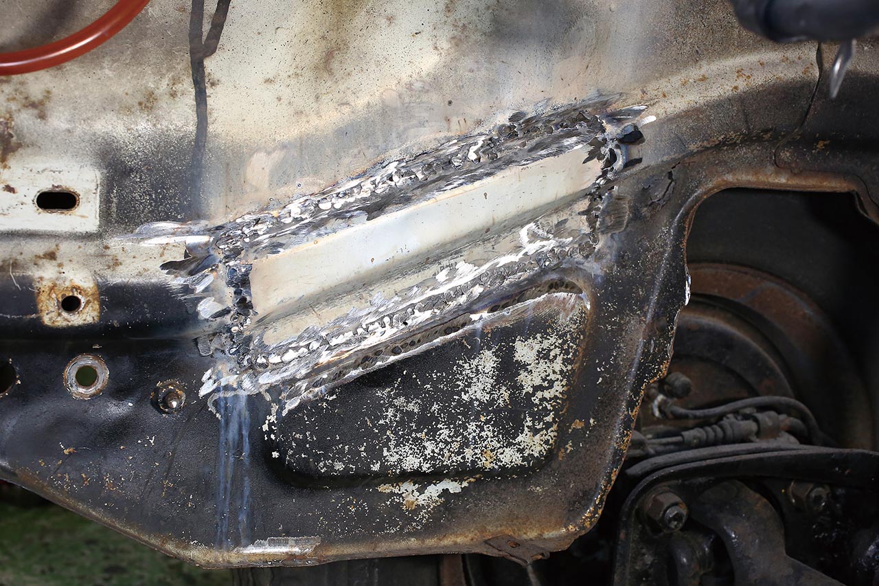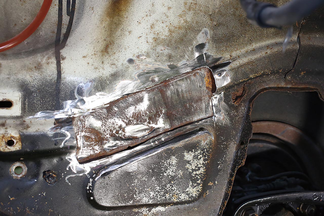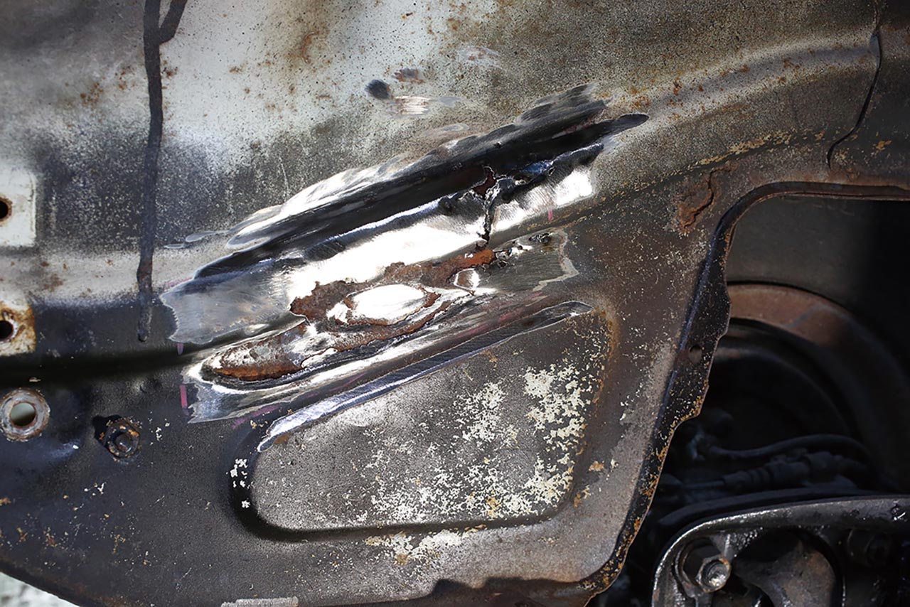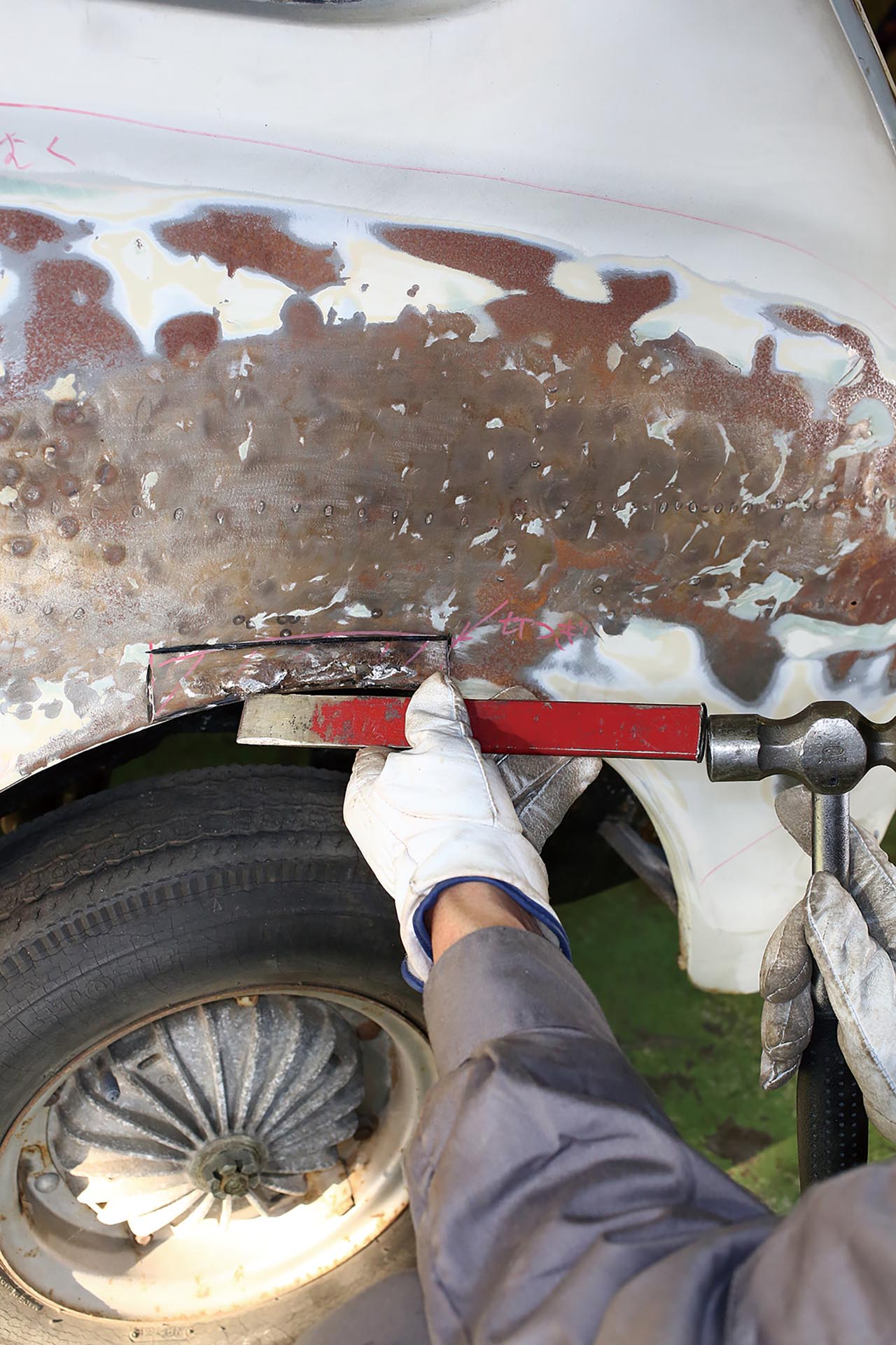 フロントばかりに気を取られ他の錆穴をすっかり忘れていた スタッド溶接機が火を噴くこともなく、無事にフロントまわりの作業は終了。パネルをきれいに修正することはできなかったが、フェンダーを変形させてなんとかするしかないだろう。 さて、フロントまわりにばかりに気を取られ、まだ他にも修理しなければならない部分があるのをすっかり忘れていた。特にリヤクオーターパネルはすべての補修が終わったと思っていたのだが、左リヤフェンダーのアーチ部分は腐食して穴が開いたままだ。まずはこの部分の修理から。腐った部分を切り取って、新しい亜鉛めっき鋼板をはめ込んで溶接。いつも通りの継ぎ接ぎ修理なのだが、半自動溶接機の調子がすこぶる悪い。ワイヤーの繰り出しが一定ではなく、途中で止まったりするので、非常に作業がやりにくく、溶接跡も汚くなる(これは下手だからかも?)。 フェンダーの補修が終わって、これでフロント以外の補修箇所は終了か? と思っていたら、エンジンルーム内にも大きな腐食穴があるのを発見。いや、以前のチェックで見つけていたはずだが、作業をするのが嫌で忘れてしまったのかもしれない。この腐食がある部分にはプレスでリブが作られている。継ぎ接ぎで修理するには、新しく取り付けるパネルでこのリブを再現しなくてはならない。幸いにもリブ部分がまっすぐだったので、手持ちの工具類でなんとか再現することができたが、複雑な形状だったら諦めたかもしれない。