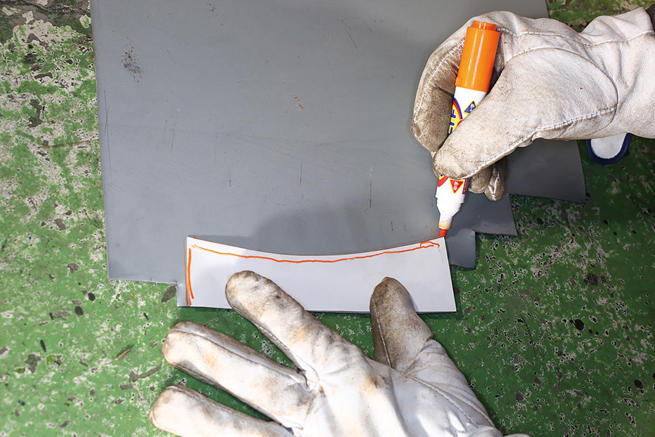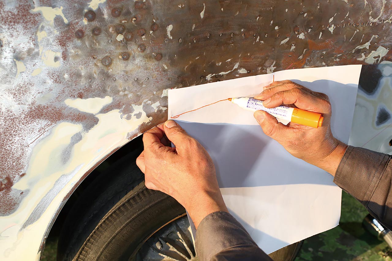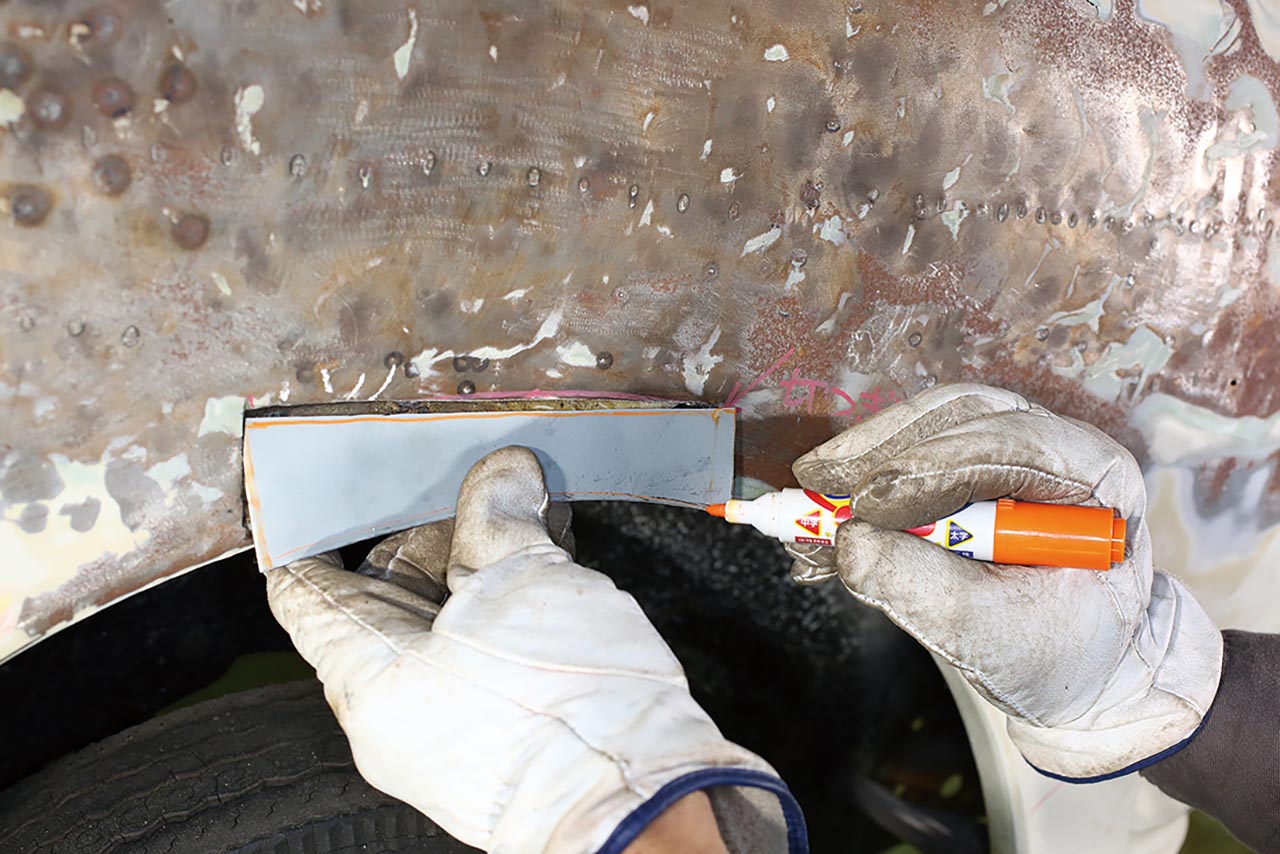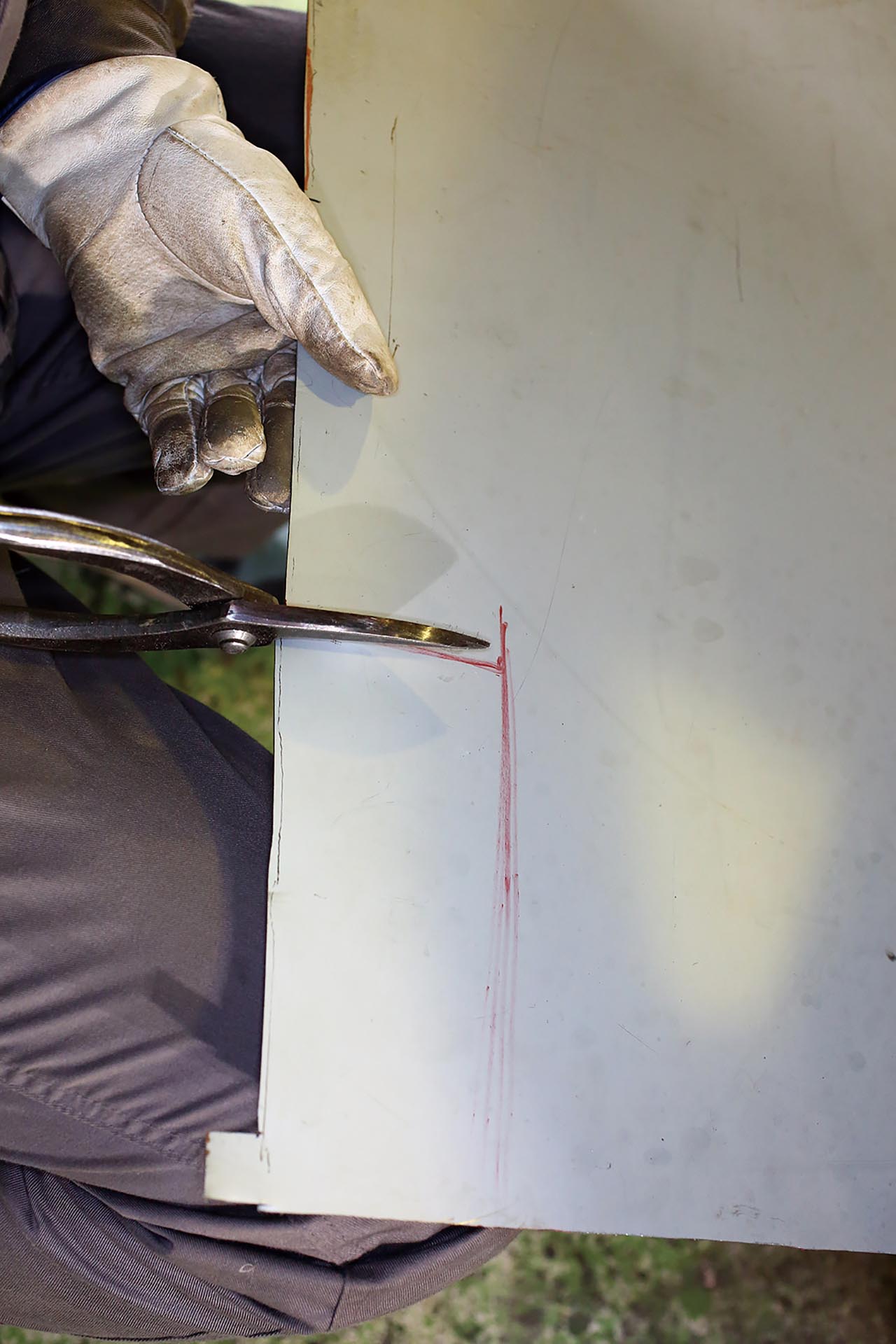 切り取ったパネルをフェンダーに当て、はみ出す部分をマーキング。鈑金バサミで余分な部分をカットして整形していく。
