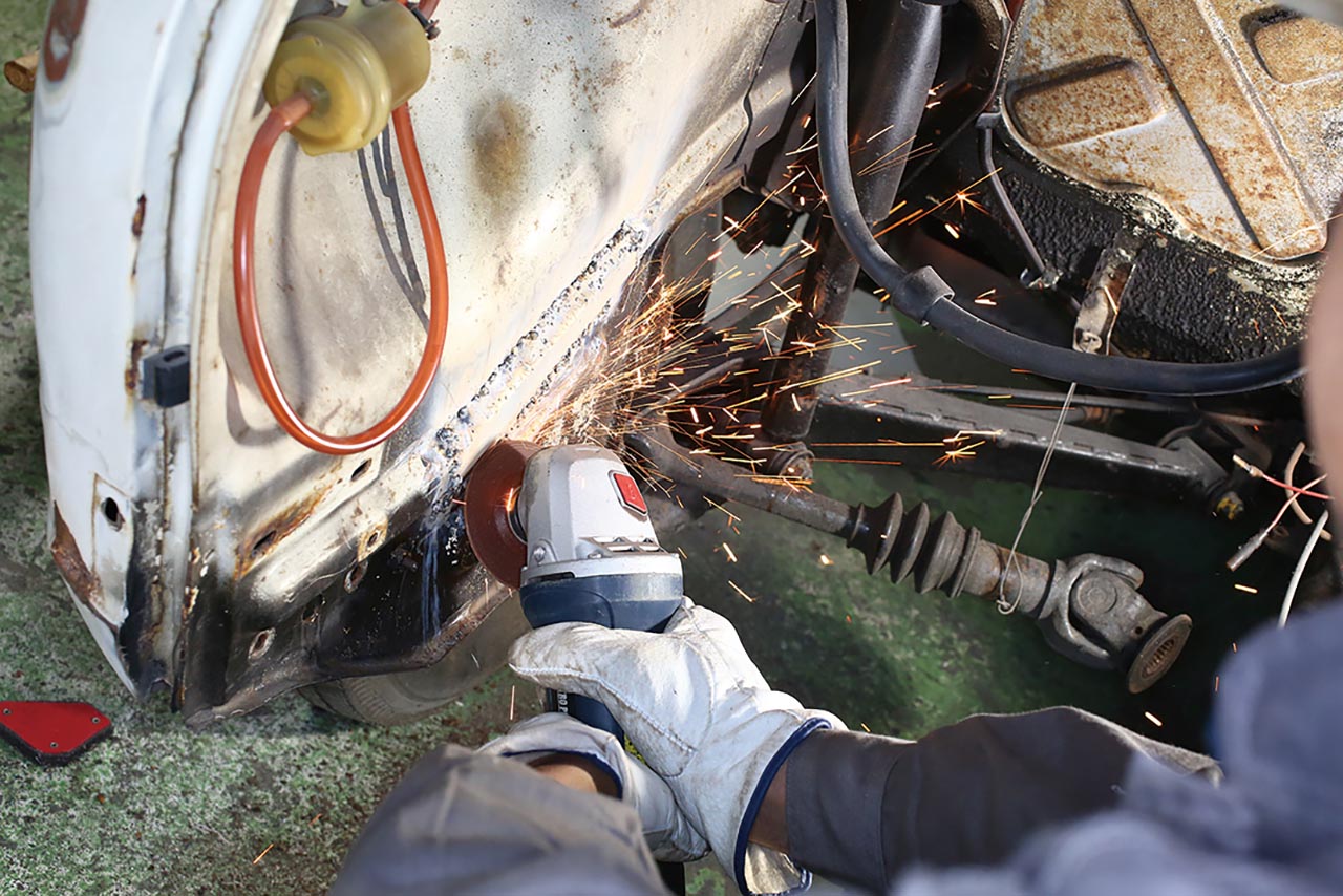 エアーカッターで患部を切り取る。エンジンルーム内は狭く作業がしにくい。腐食の範囲が広く、切り取る部分も大きくなってしまった。