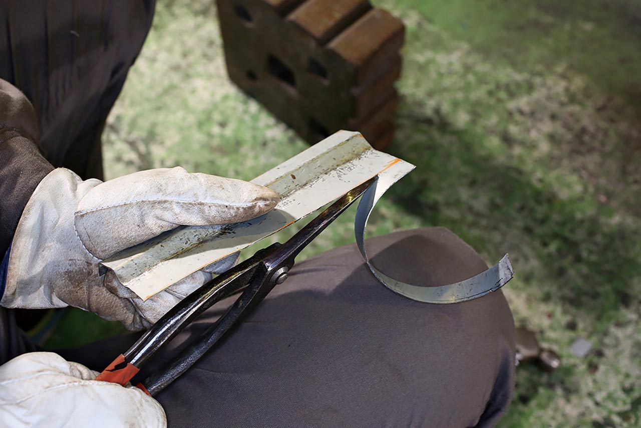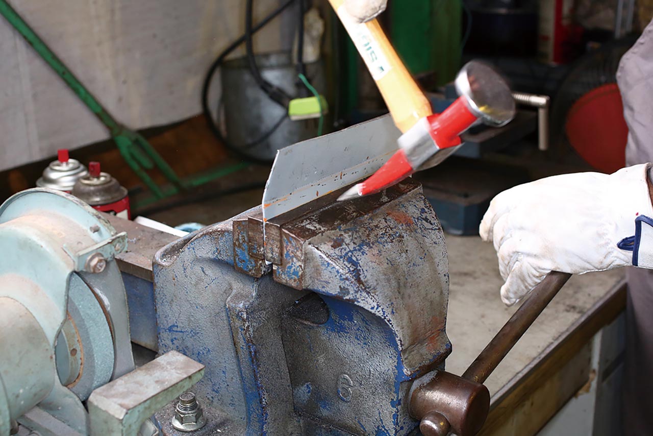 谷折、山折、山折、谷折の順でパネルを曲げなくてはならないが、これが非常に難しい。タガネや当て金などを使ってリブを再現する。