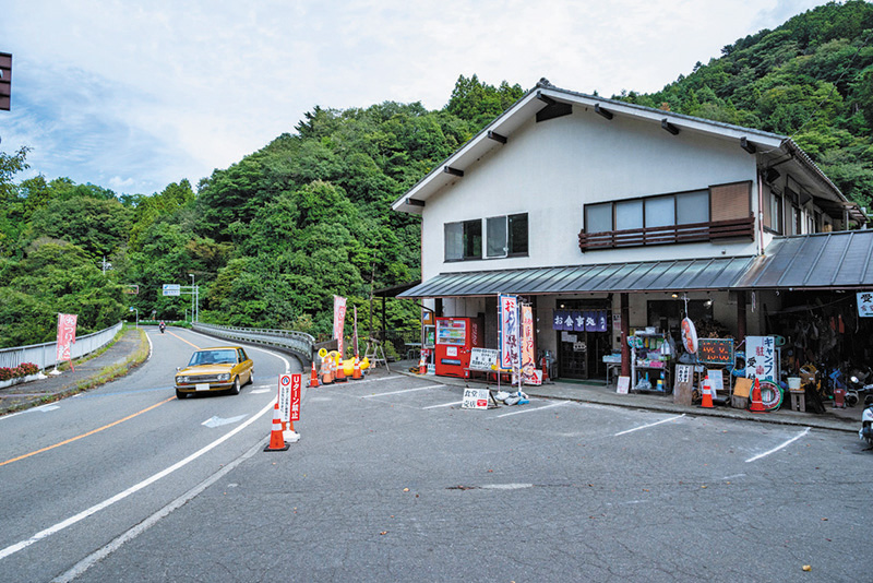 当時は週末になると訪れるギャラリーとクルマがあまりに多すぎて渋滞が発生。走ることができないといった1コマも。「いろりの里 ごん助」は当時から変わらず営業する食事処だ。