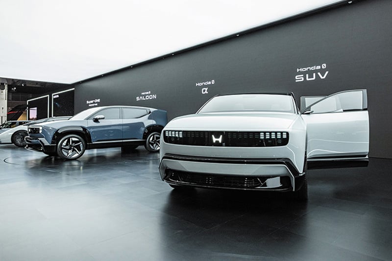 壇上にならんだHonda 0(ゼロ)シリーズの3台。Honda 0 SALOON、0 SUVの量産モデルは2026年に北米市場へ投入される予定。搭載される独自のビークルOS「ASIMO OS」が演出する新しい移動体験にも注目だ。