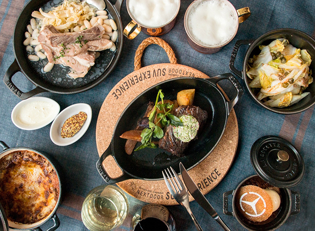 ゲストラウンジでは、ストウブ鍋を使った限定メニューでアウトドアやSUVの世界観を演出。「塩漬け豚スペアリブと白インゲン豆の煮込みシュークルートとレフォールのソース添え」、「牛ハラミのバベットステーキ 色々なお芋のフレンチフライと海藻バター添え」というガッツリ系のメイン、「里芋の皮付き岩塩ロースト 燻製の生ハムスペック添え」をはじめとするサイドメニュー、デザート「バナナのキャラメリゼ ホットチョコレートをかけて バニラアイスを添えて」などがドイツワインやソフトドリンクと一緒に味わえる。