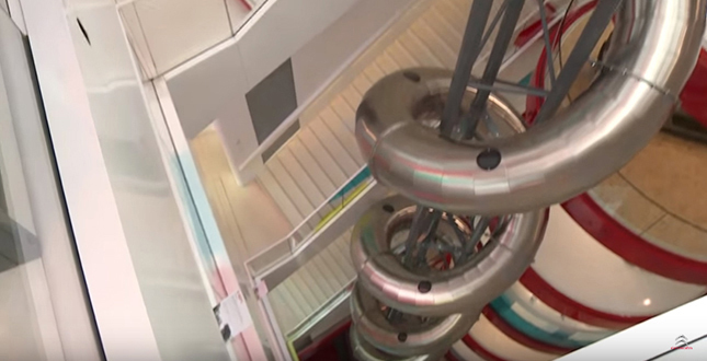 しかし、今回の模様替えのなによりの注目は滑り台の登場。単なる滑り台じゃありません。4階から地下まで降りられ、高さ26m、全長63m、滑走時間15秒という冗談みたいならせん状の名物滑り台が復活したんです。やったぞ!