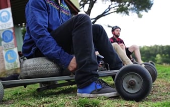 サスペンションもない簡素なフレームに4つの小さなタイヤを備えただけのカート。古タイヤのシートに座って、グリップをしっかり握って坂道を下ります。前輪は、足で踏み込むことで左右に舵を切れる仕組み。