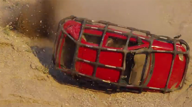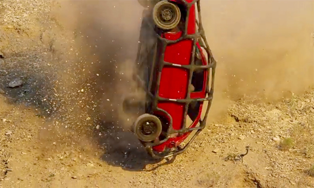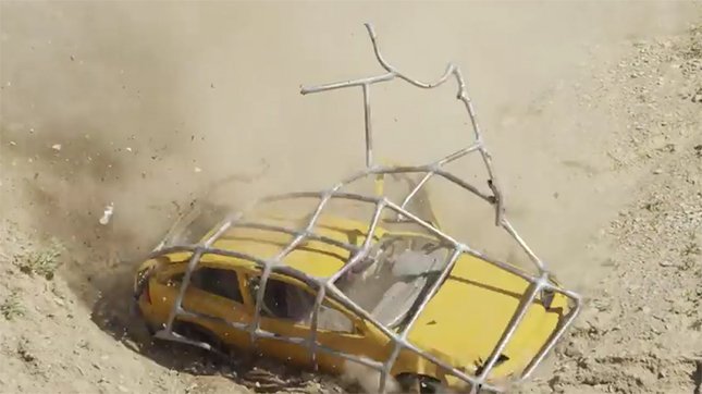 クルマが崖を転がり落ちるときの衝撃って、そうとうなもんですよね。ふつうなら、クルマは潰れたりひしゃげたり、パーツがもげたりします。では、クルマ全体をケージでカバーしたら?