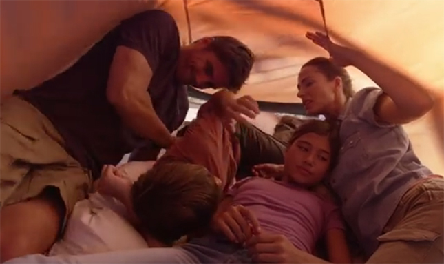家族キャンプのときは、これまた最適なアクセサリーが用意されているんです。一般的なテントでは設営するのもたいへんだし、狭いし、楽しめないですよね。もっとも、これはひとり用のテントに家族4人で入ってるので、そりゃギュウギュウにもなるでしょう……って感じではありますが。