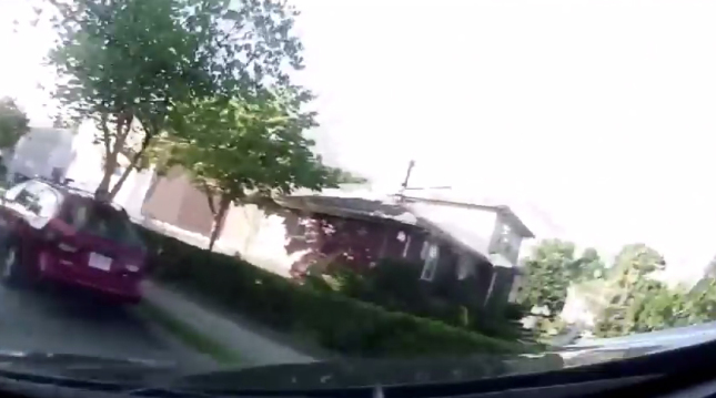 BGMもなく走行音だけが響く動画は、交差点を越えたところで突然視界がひっくり返ります。外部からの映像がないのではっきりとはわかりませんが、どうやら横転してしまったようです。