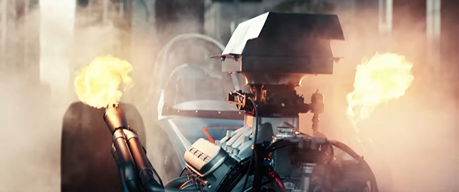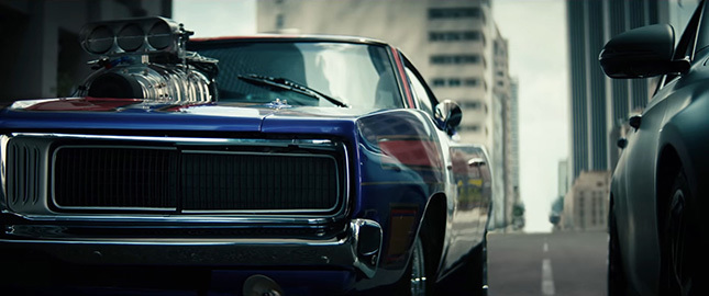 今度はもう一方に、ダッジ チャージャーのドラッグレーサーが停まります。ボンネットから突き出たV8エンジンは、まさにマッスルカー全盛時代からタイムスリップしてきたかのようです。