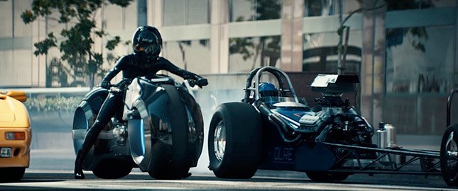 そうしていると、ディアブロの横にはSF映画トロンから飛び出してきたかのようなスポークレスの電動バイクや超軽量な現代のドラッグレーサーが並んできます。