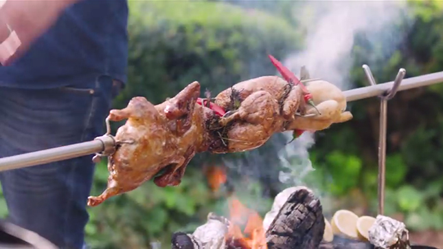 バーの一端をフロントグリルに預けて、炭火でチキンを焼いてます。なにもそんなところにバーを渡さなくても……と思ったら、エンジンの機構を使って回転させているのです!