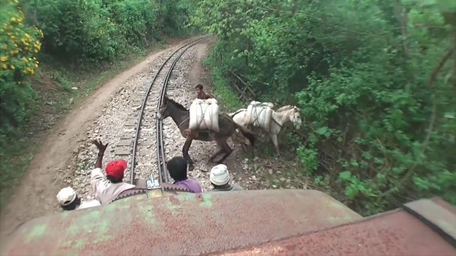 青年は、通行を妨害したことを詫び、脇道を通り抜けていきます。あまりに森林が深すぎて、線路が道路のように機能しているのでしょうか。