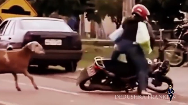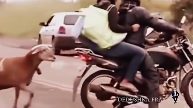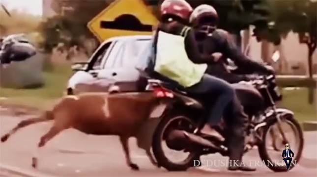 オートバイに乗っていた人は、はね飛ばされるほどではありませんでしたが、よろけて倒れてしまいました。体がそれほど大きくないしツノもないので、大怪我をするようなことにならなくてよかった。それでもけっこう力強いんですねぇ。驚きました。