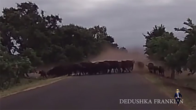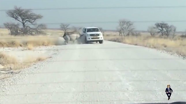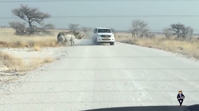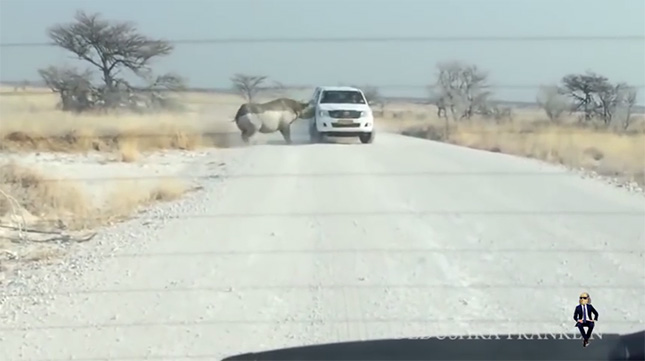 サイはいったん後退して、再度突進。1度目ほどの衝撃ではないものの、車内にいたらかなり恐怖を感じたでしょう。