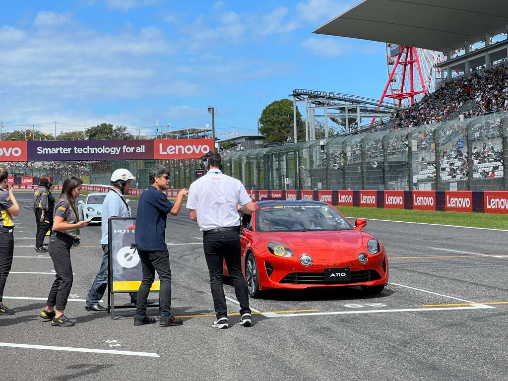 ホスピタリティテント内でドライバーとの記念撮影やガレージツアーなどの他、目玉となるのがピレリ・ホットラップだ。2018年から行っている同コンテンツはレーシングドライバーが操るスポーツカーでグランプリが行われるサーキットを同乗体験できるもので、いわゆるサーキットタクシー。日本GPではアルピーヌ、アストンマーチン、メルセデスAMGが用意され、自分はアルピーヌA110Sに同乗した。