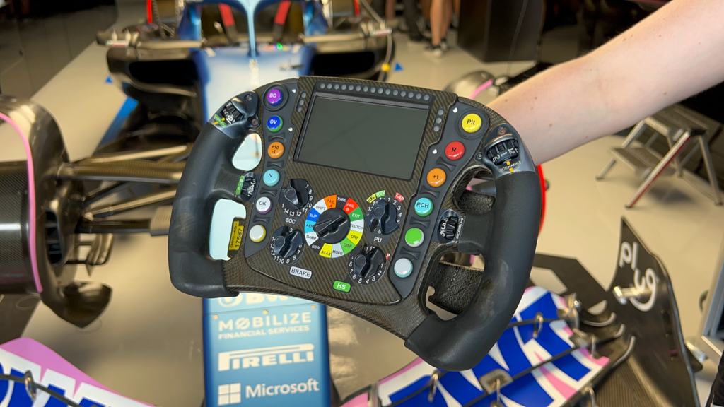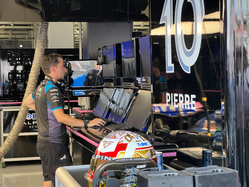 その後はBWTアルピーヌF1チームのタイヤ交換の見学をしてからスタッフによるガレージツアー。レース中は、どこにどういった役割の人物が配置されるかなど詳細な説明がなされる。ピットウォールに設けたスタンドにはストラテジスト、チームマネージャー、スポーティングダイレクター、チーフエンジニアなどおもに技術担当者。ピット内ではピエール・ガスリー車、エステバン・オコン車それぞれにパフォーマンス・エンジニア、レース・エンジニア、200を超えるセンサーからの情報やステアリングシステムの電気システムの担当者、パワーユニットのエンジニアなどが陣取る。フリー走行、予選、決勝で場所がかわることもあるそうだ。