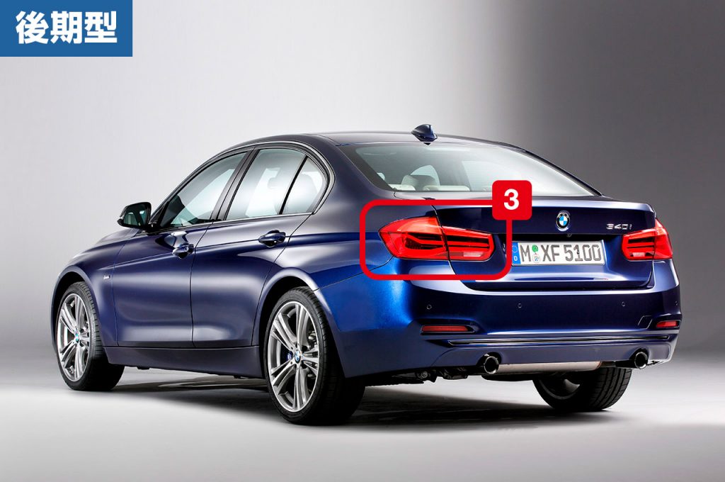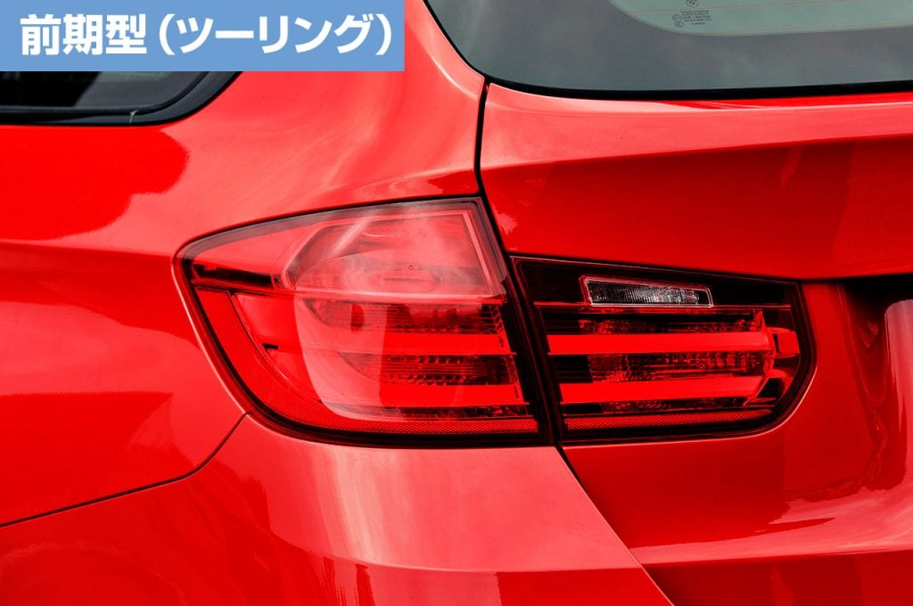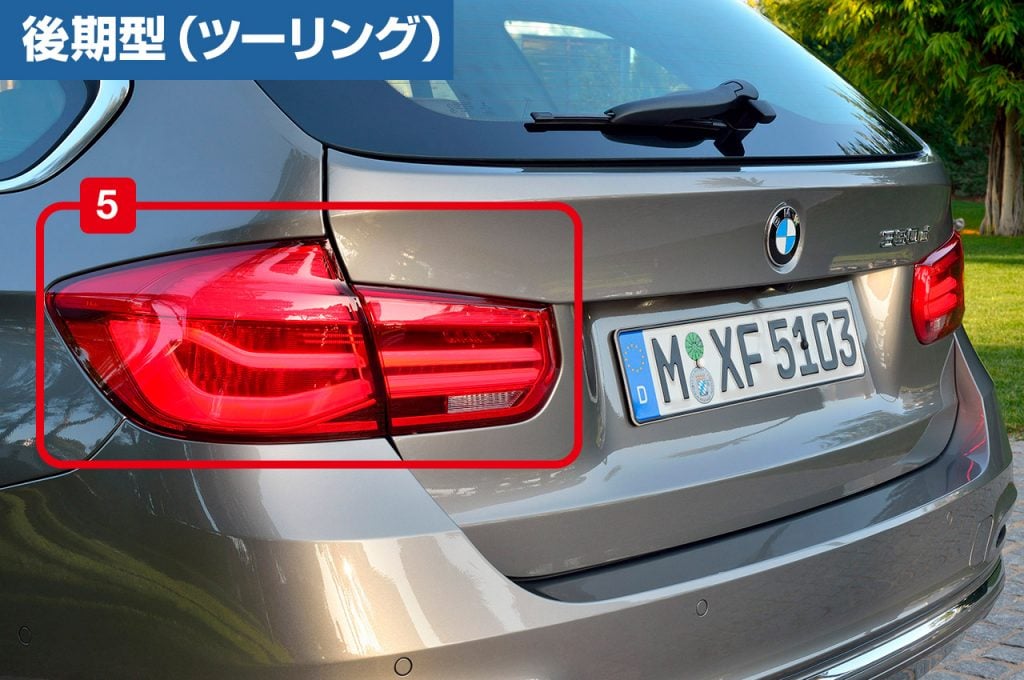 3シリーズツーリングのリアまわりを比較。こちらもセダンと同じく、後期型のL字型リアコンビランプは躍動的な曲線を描いたLEDライトバーを採用。プレミアムワゴンらしいモダンさを強めている。