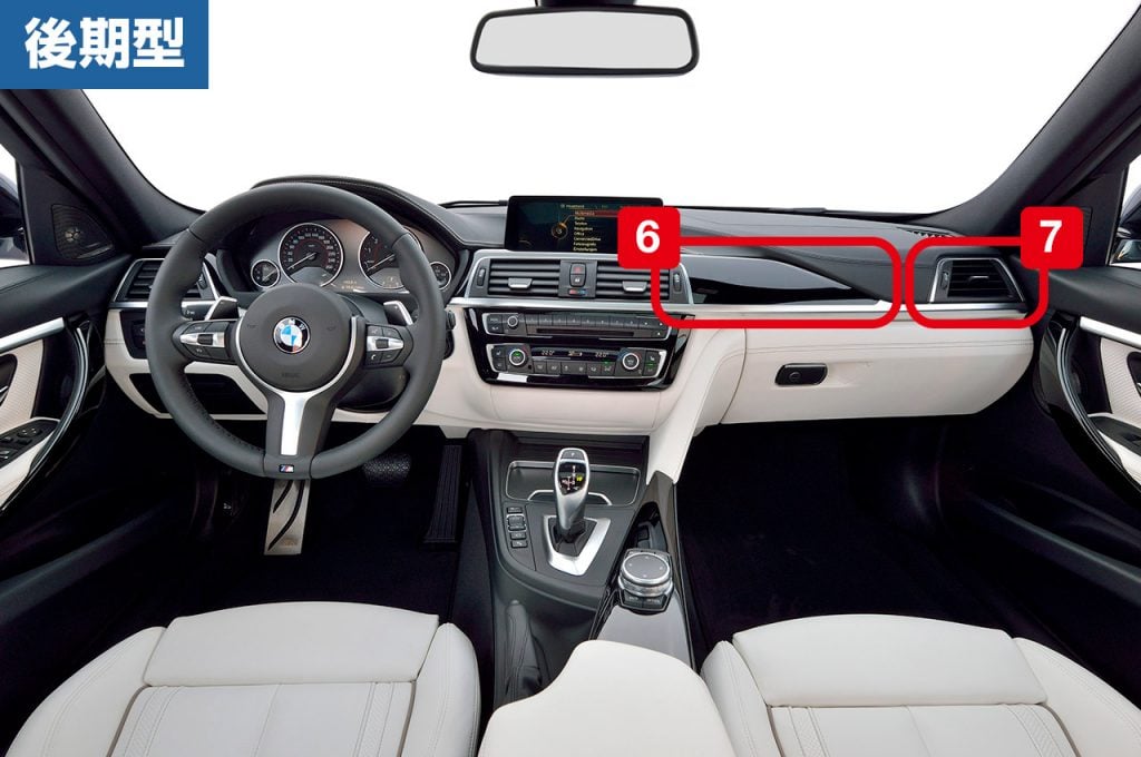 次にインテリアを比較してみよう。前期型(上)がラグジュアリーライン、後期型(下)がスポーツライン。センターパネルは、前期型がマットブラック仕上げなのに対し、後期型はハイグロスブラック仕上げとなるのが大きな違い。また、後期型ではエアアウトレット周辺部にクロームアクセントが施され、エレガントになった。