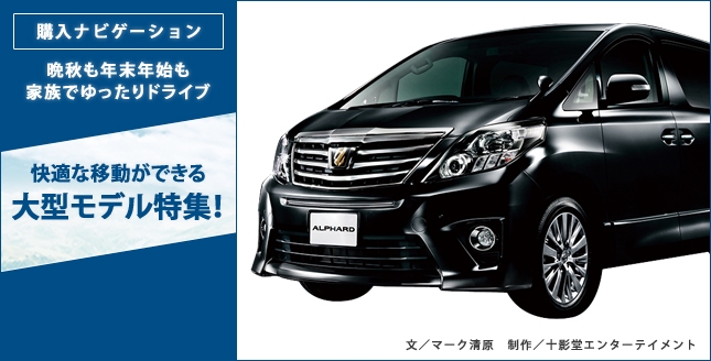 トヨタのフラッグシップミニバンがアルファード。2代目となる現行型は、最上級ミニバンらしい充実した装備と高効率なエンジン&ミッションを得ていることが特徴である。また、迫力ある外観と大きなボディは、ミニバンの域を超え高い風格を漂わすもの。ファミリーカーとして贅沢な使い方ができると同時に、運転するお父さんも高い満足感が得られるモデルである。