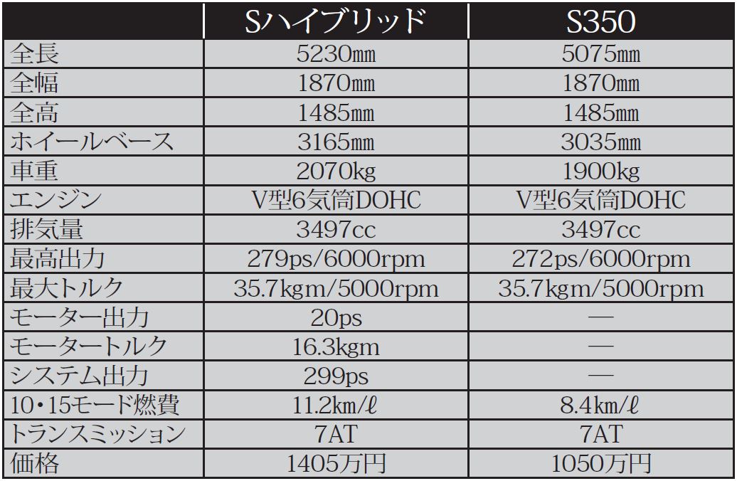 気になるハイブリッドシステムは、最高出力279psを発揮するS350に搭載される3.5L、V6に20psを発揮するモーターを組み合わせたもの。システム出力は279ps、システム最大トルクは35.7kgmとなり、4クラスのトルクが特徴的。10・15モード燃費は11.2km/LでS350の8.4km/Lに対して約130%という数字。コンパクトなリチウムイオンバッテリーをエンジンルームに配置しているのがポイントで、モーターによるアシスト量はトヨタ方式ほど大きくはないが、バッテリーがトランクスペースを犠牲にすることなく、また、ハイブリッド化による重量増も75kgに抑えられている。トヨタ方式の場合、例えばGS350に対するGS450hの重量差は240kg。GS450hはハイパワーモーター型ハイブリッドでモーター出力は200ps。10・15モード燃費は14.8km/Lで、モーターアシスト力の大きさを実感できるコンセプトというか、狙っている方向性の違いを如実に感じる部分である。価格は1405万円。S350の400万円アップで、日本製ハイブリッドからするとちょっと……。