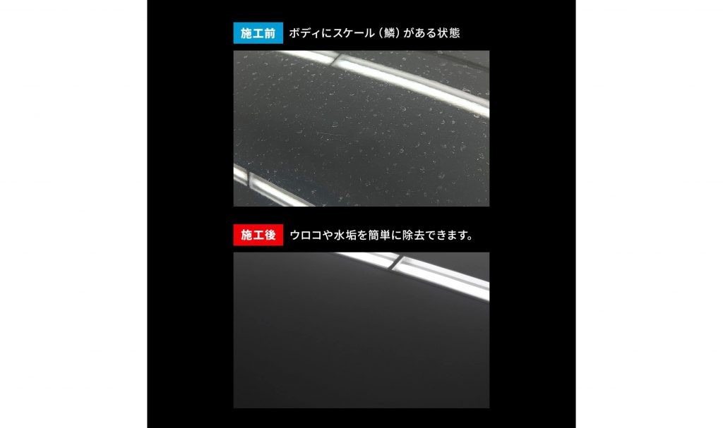 同製品は、水垢やウロコを除去するスケール除去材(水垢落とし酸性クリーナー)。クリア塗装されているボディ、アルミモール、アルミホイール、窓ガラス(※フロントガラス、キズの多いガラスは除く)に付着した汚れを簡単に除去。特にスポット的な水垢には高い効果を発揮する。