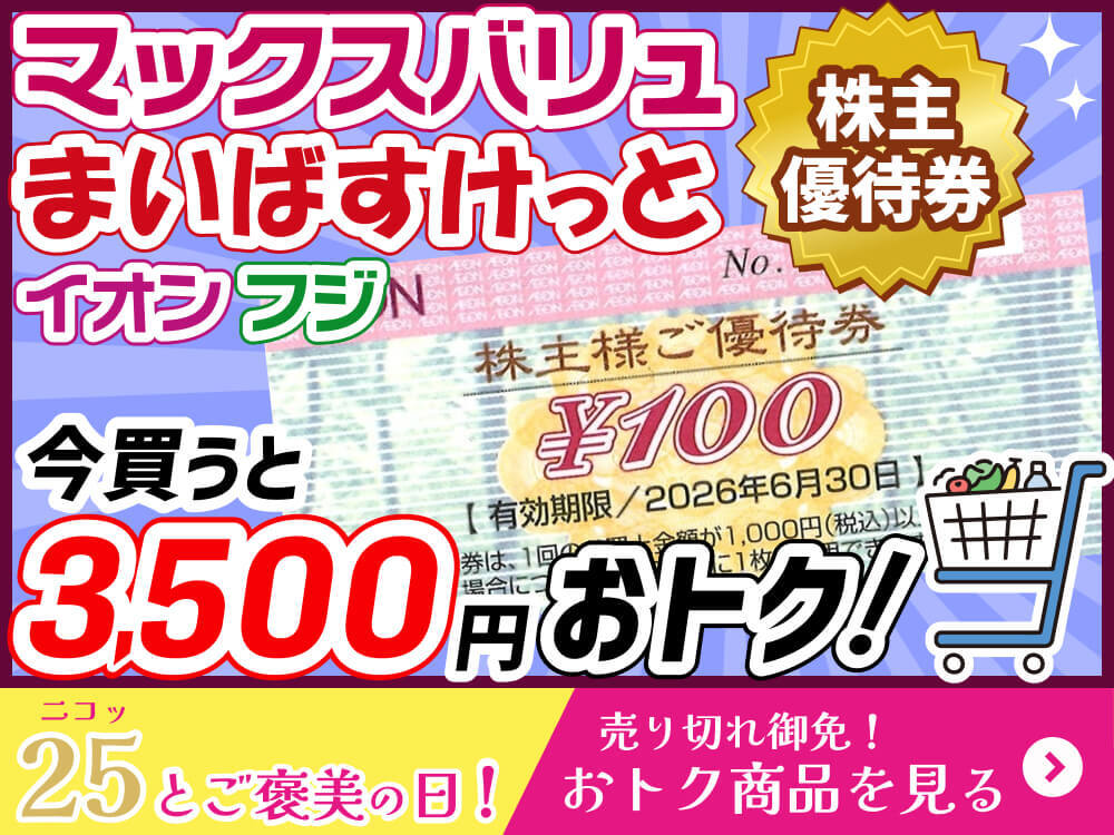 いつものお買い物に使えるイオン/マックスバリュ/フジご優待券がお得に!「マックスバリュ」や「まいばすけっと」などで使える10,000円分(100円券×100枚)のご優待券を今なら35%おトクにご提供。1回のお買い上げ金額が1,000円(税込)以上の場合に、1,000円毎に1枚(100円分)ご利用できます。