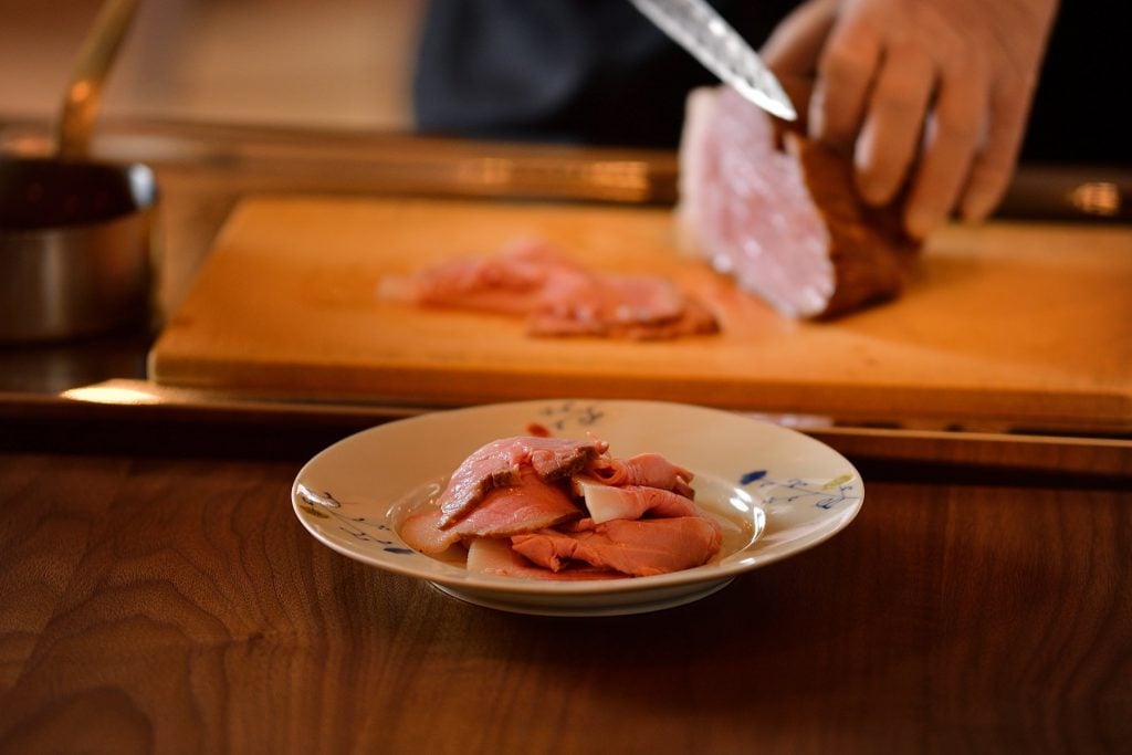 魚沼の銘柄豚「妻有ポーク」を味付けし、68度の温泉熱で3時間、低温調理した「湯治豚(とうじぶた)」は、目の前で切りたてをサービスするちとせのスペシャリテ。とろけるような柔らかさは一食の価値アリ!