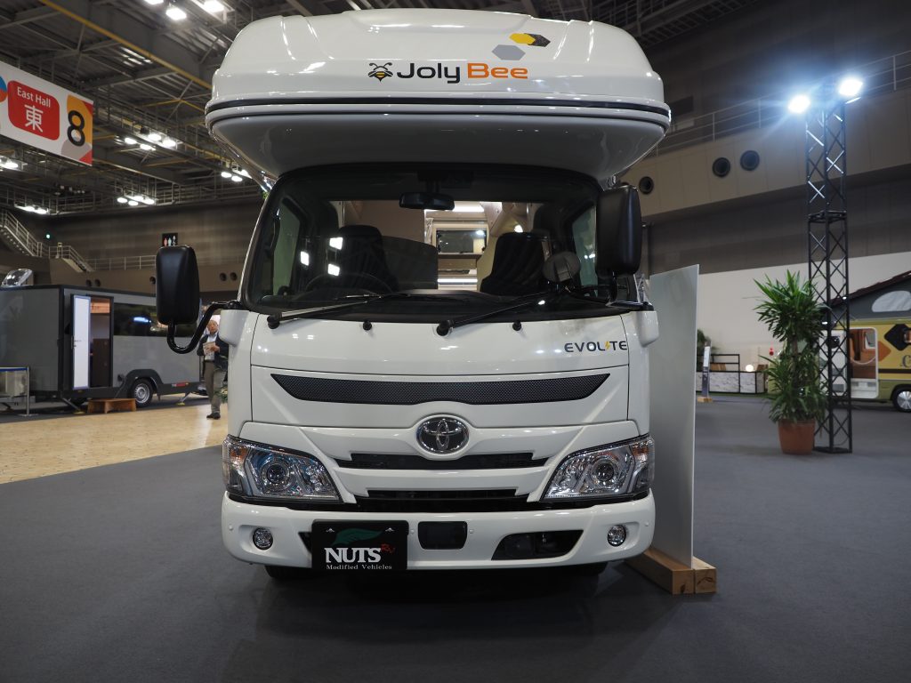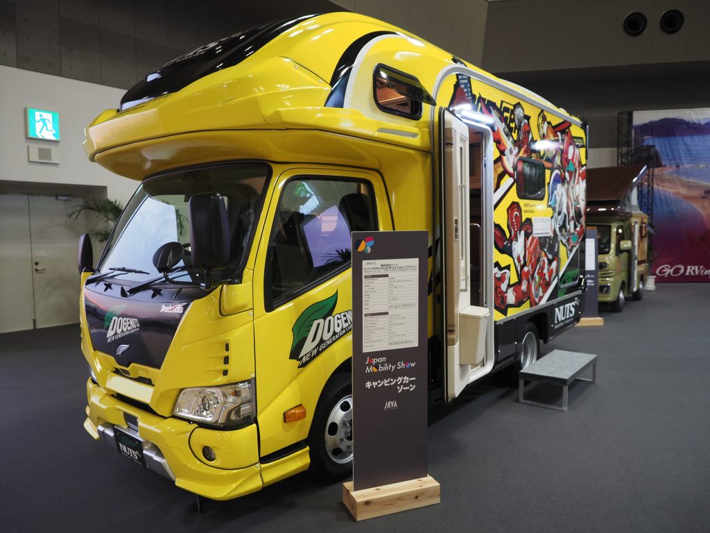 また、別のアプローチを見せたのは、ナッツRVのクレア ハイパーエディションⅢ 5.3 type‐X「ドゲナッツ」というモデル。同じく、トヨタ「カムロード」をベースとし、全長は5250㎜と更に長い車両となるが、こちらはバスや電車などでも用いられることのあるラッピングという手法を使って、自由なデザインが可能であることを示すために展示されたコンセプトモデル的なクルマだ。