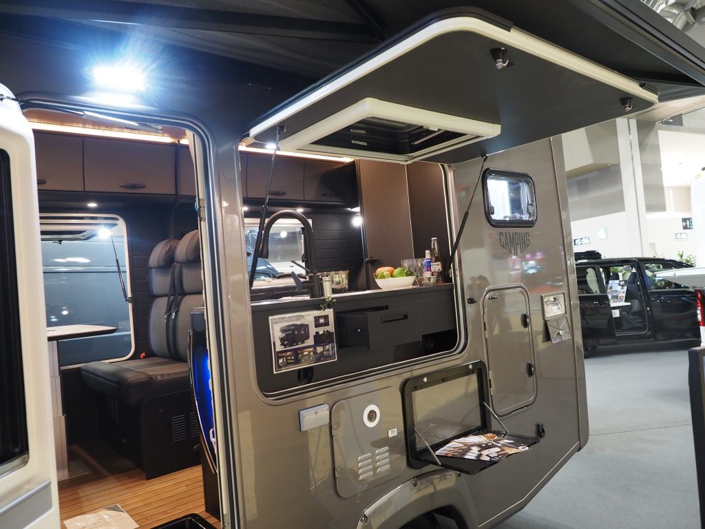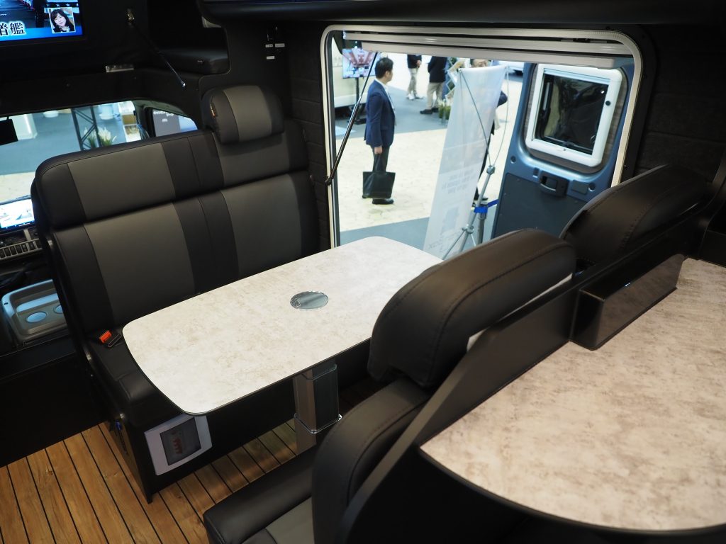 そんな骨の折れる作業をしてでも、ニーズに応えようとした例が、ダイレクトカーズの「トリップ ブラックエディション」だ。トヨタのキャンピングカー用ベース車両となるトラック「カムロード」を使った、全長5150㎜×全幅2160㎜×3050㎜という大きなボディ(乗車定員7人、就寝定員大人4人+子ども2人)に、停車時にキッチンカーのように外側に開いてミニテーブルなどが現れる「サイドバゲッジ」なども装備しているが、外装はシルバーグレー系の色に塗装。室内は天井と床こそウッディーなものの家具や壁面はブラックでまとめている。