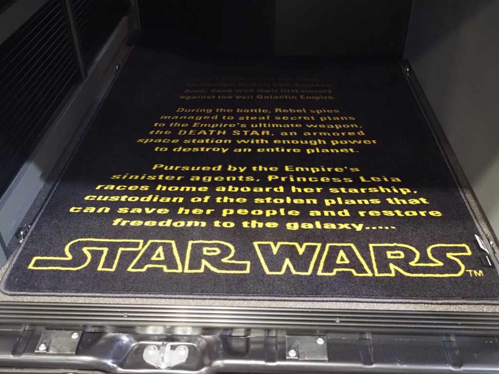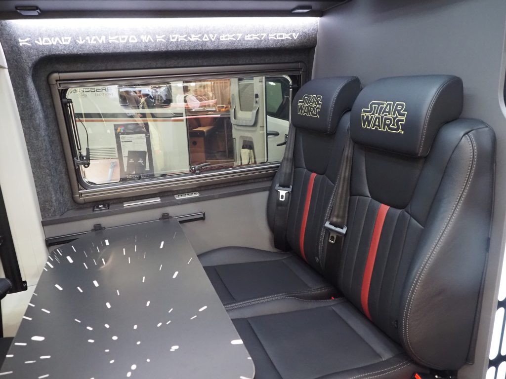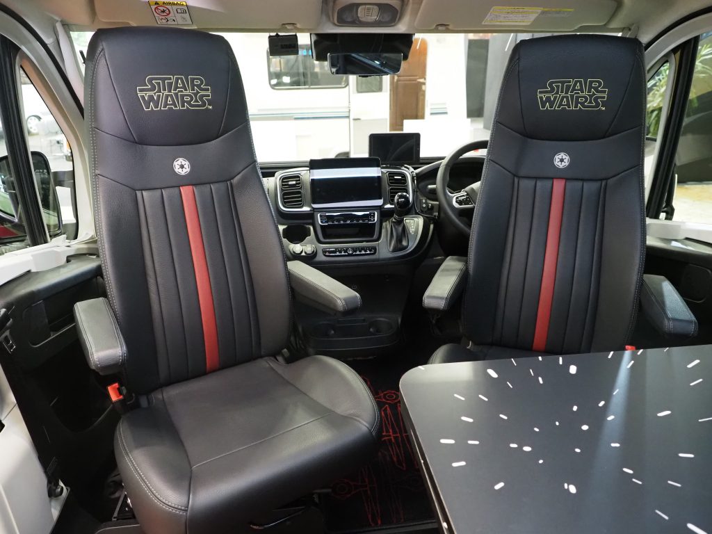 今回はルーカスフィルムの公認も得て、フィアット「デュカト」という商用バンをスターウォーズの世界観に染めた。全長5,995㎜×全幅2,100㎜×全高1,880㎜という大きなボディでありながら、乗車定員4人、就寝定員2人というこのクルマは上質な装備とゆったりとした空間が魅力。