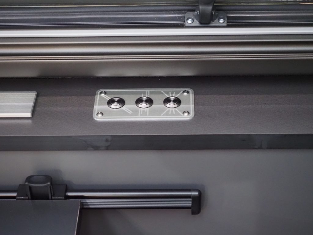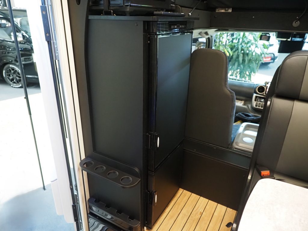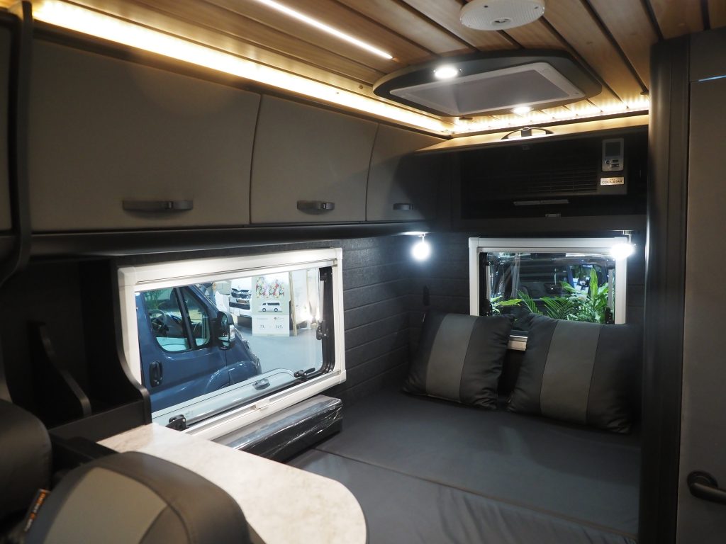 いくつかのビルダーに尋ねると、「60歳以上の層は見た目よりも機能を重視する一方で、30代、40代は見た目も重視する傾向。そういった若い世代にブラックやグレーの室内色が人気」と話す。シックでおしゃれな印象はもちろん、キャンピングカーには付き物の汚れが目立ちにくいというメリットもある。