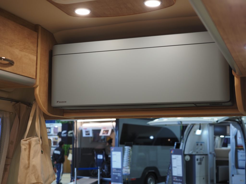 例えば、ダイレクトカーズのキャンピングカーでは、室外機をスペアタイヤを収めるスペースに格納したり、天井に乗せるなどして、限られた車内空間をより広く使えるようにしたケースが見られる。
