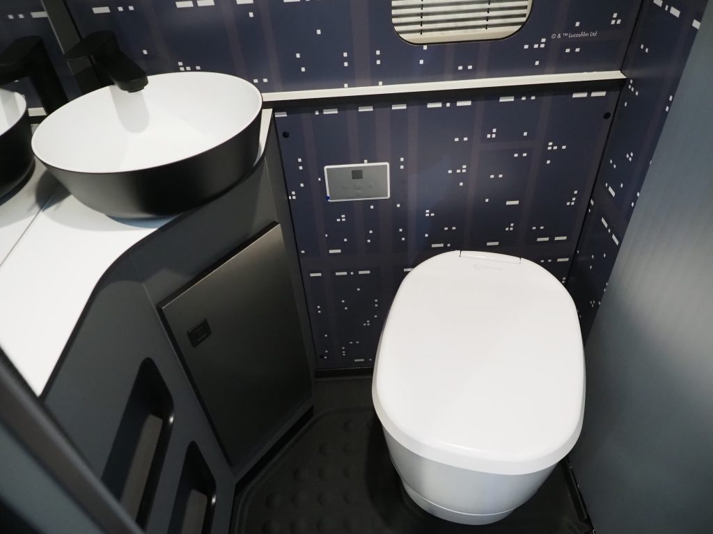 そのベース車の魅力と作品の魅力が溶け合うよう、キャラクターなどは極力配さず、スターウォーズの印象的なモチーフや配色、音声などを駆使して、作品の世界に自分がいるかのような没入感を与えるキャンピングカーに仕上げている。