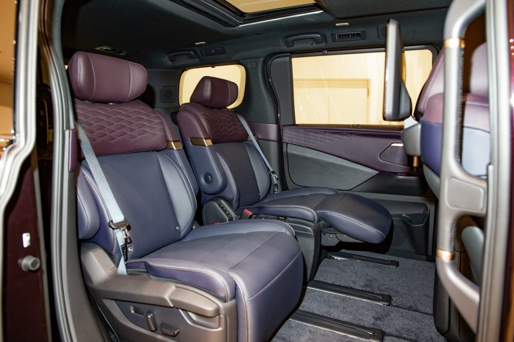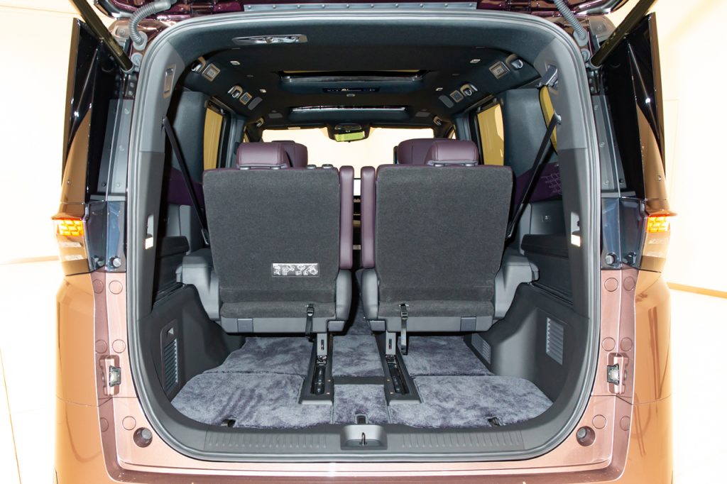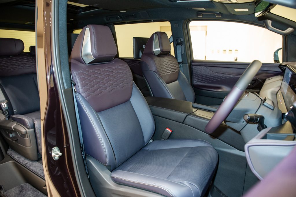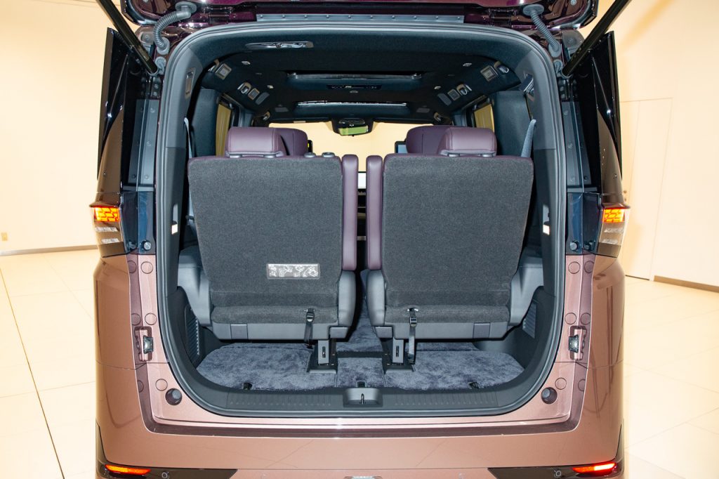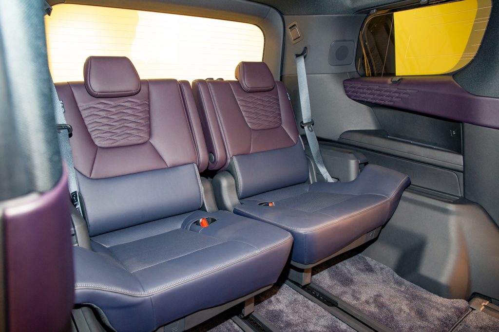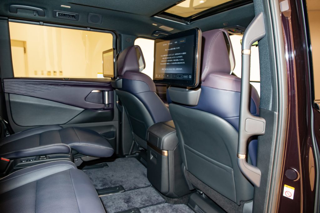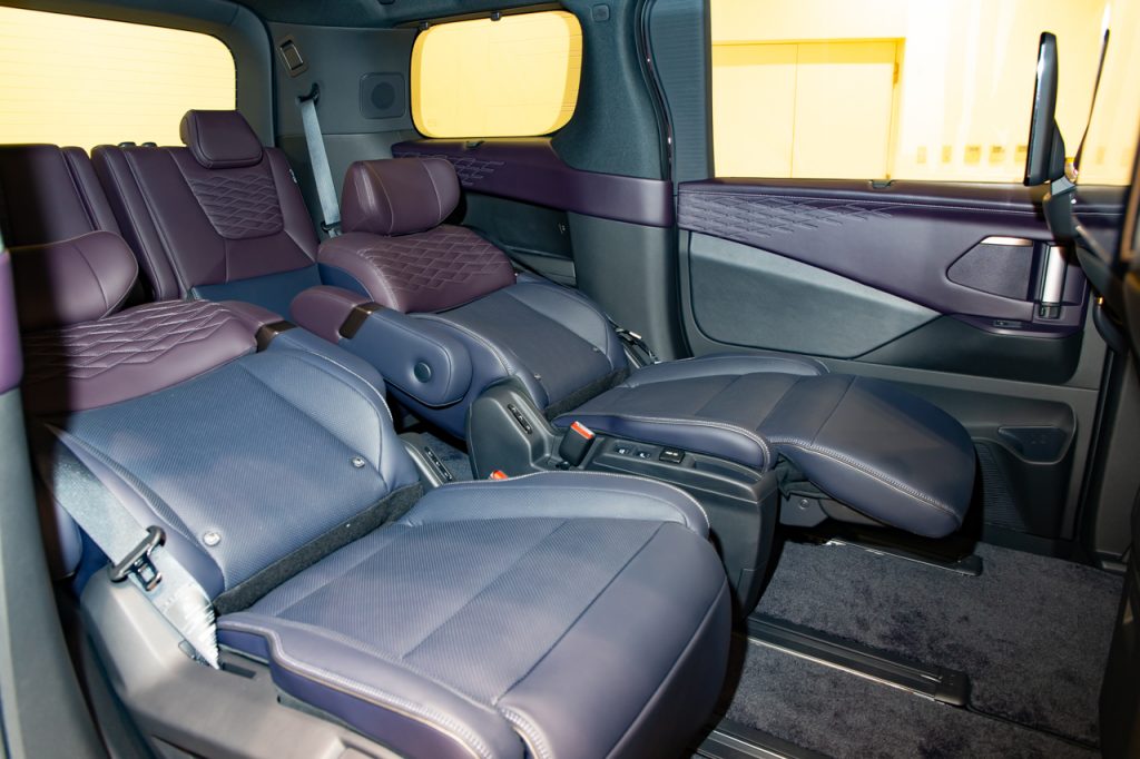 重要な2列目シートは中折り機能とオットマンを採用。これによってゆったりとした姿勢のもと、「e-4ORCEの振動のなさにより、本当に宙に浮いているかのような感覚で移動していただけるだろう」と佐藤さん。