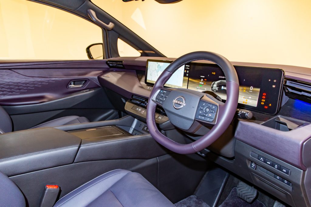 インパネには14.3インチダブルのモノレススクリーンと、スイッチ類はシームレスにインパネに配置したほか、間接照明がインパネからドアにかけて入るなどで、「テクノロジーとシャープなデザイン表現で、イノベーティブな日産らしさも表わしている」と述べる。