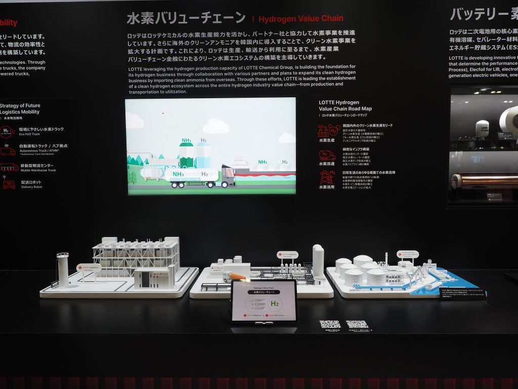 このほか、化学製品の開発を生かした水素の生産などクリーンエネルギーにも力を入れており、水素トラックの活用などにも活かされている。次世代の自動車燃料としても注目されるアンモニアのインフラについては9万3000tの貯蔵が可能という大規模なものが施設を蔚山に構えており、そこから福岡県の北九州市までの距離は220㎞ほど。日本での需要にも対応する構えだ。