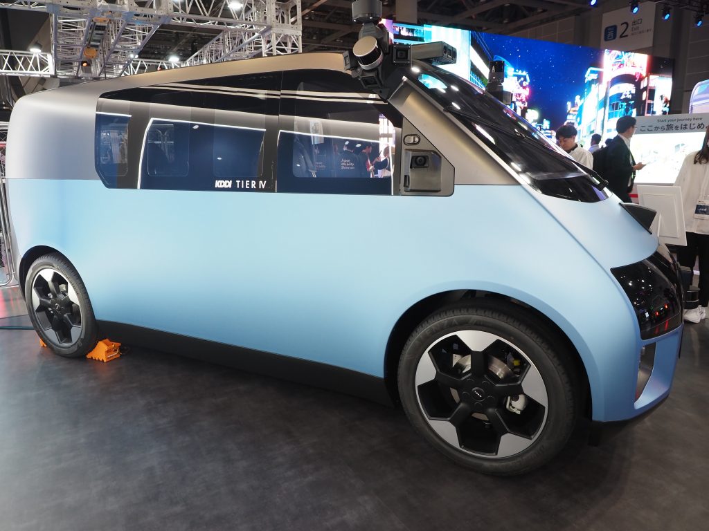ジャパンモビリティショーで展示された車両は、KDDIが出資するオープンソースのソフトウェア開発を行う企業「ティアフォー」のもの。レベル4の自動運転を搭載している。