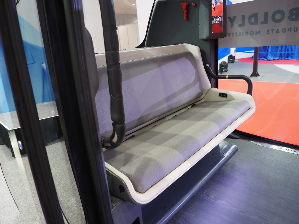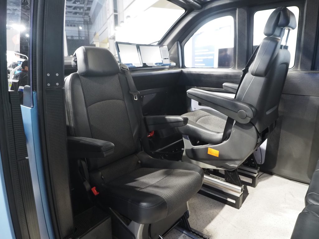 カーリースなどを手掛けるSMAS(住友三井オートサービス)が展示した車両は「ROBOBUS」。中国の自動運転EV企業「PIX Moving」社製の車両で、レベル4の自動運転を搭載した6人乗りのモデル。ソフトバンクの子会社である「BOLDLY」とSMASは、ドライバー不足でバスの減便などが進む中、地域交通を守ろうと、このROBOBUSを活用し、全国の自治体と協力して実証実験を行っている。
