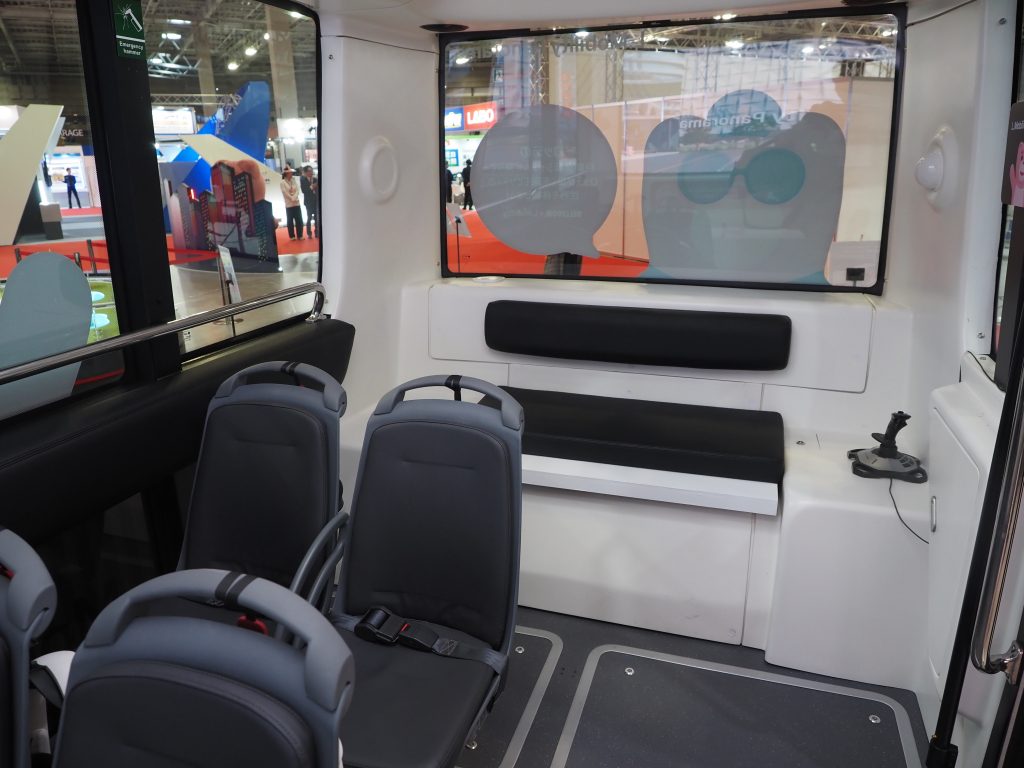 カメラやセンサ、GNSS(衛星測位システム)などを活用し、事故状況などを把握して自動運転を行うこの車両は、運転席がなく、ステアリングのようなものは見当たらない。非常時には、家庭用ゲーム機のコントローラーのようなもので操縦するというのも近未来的だ。