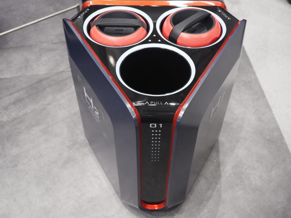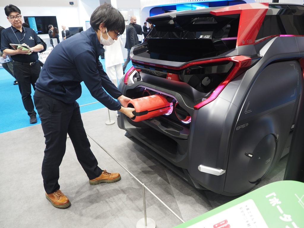 豊田合成が出展した「フレスビーハイコンセプト」は水素で走る燃料電池車のコンセプトモデル。ポータブル水素カートリッジはクルマやスクーターのほか、調理用の熱源や夜間作業用の電源としても利用可能。実際にリンナイの水素調理バーナーと合わせてトヨタ自動車の食堂で実験的に活用されている。