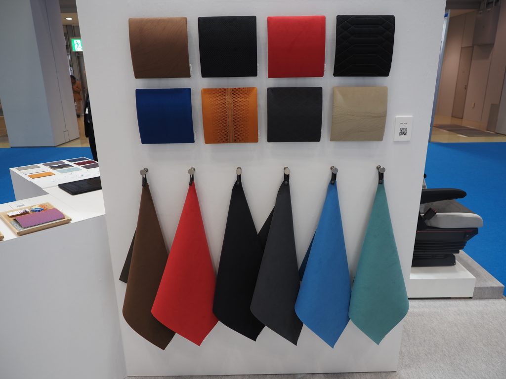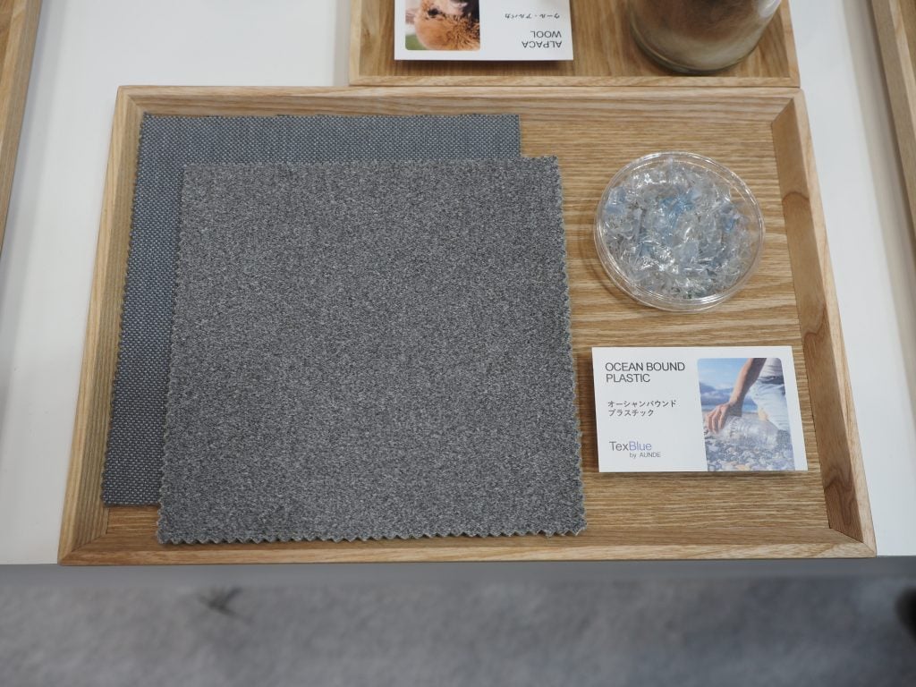 アウンデ紡織はリサイクルを強く意識したシート素材などについて提案。生態系への影響が叫ばれている海洋プラスチックから作った生地や、リサイクルしやすいようにウレタンを使わず両面PETで作った生地のほか、炭や竹、さとうきびなどの天然素材を使った生地なども展示した。