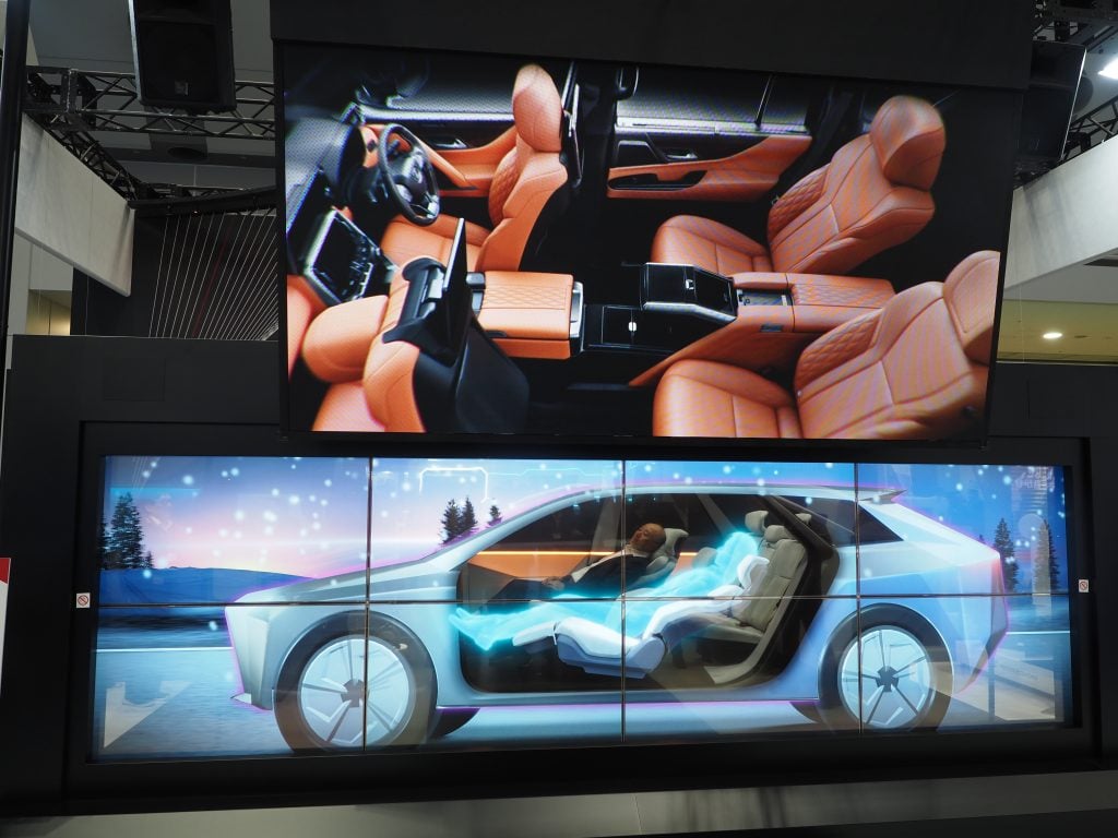 薄型化は、軽量化や室内スペースの確保に役立ち、さまざまな車両への搭載を可能とする。展示では運転席の位置に設置されたが、実際にはミニバンやSUVなどの2列目以降のシートなどにも活用されるものと思われる。