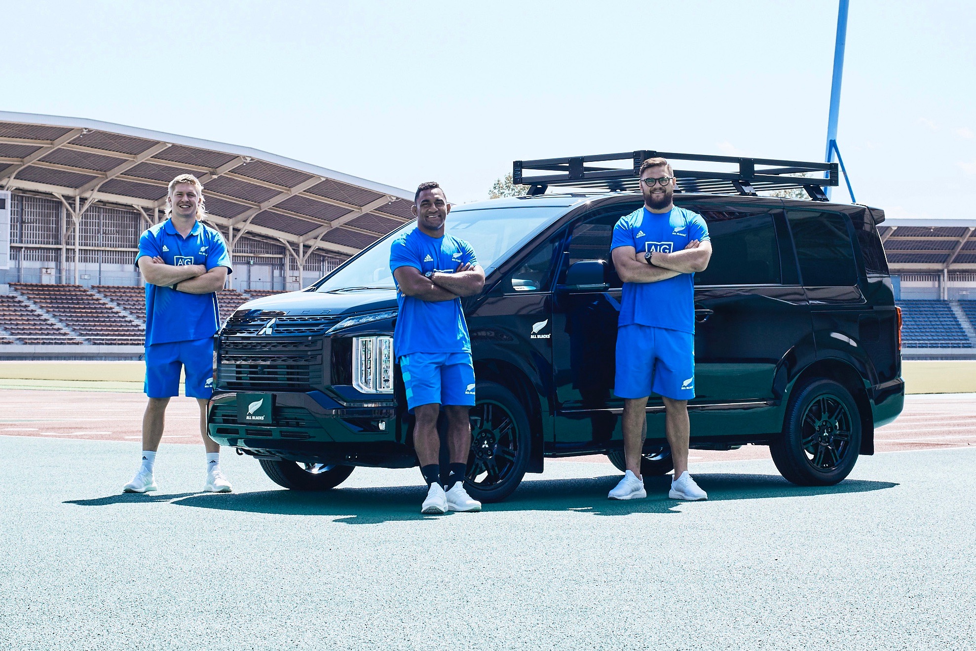 デリカD:5 オールブラックス エディション(オプション装着車)と、ラグビーニュージーランド代表のジャック・グッドヒュー選手(左)、セヴ・リース選手(中)、アンガス・タアヴァオ選手(右)
