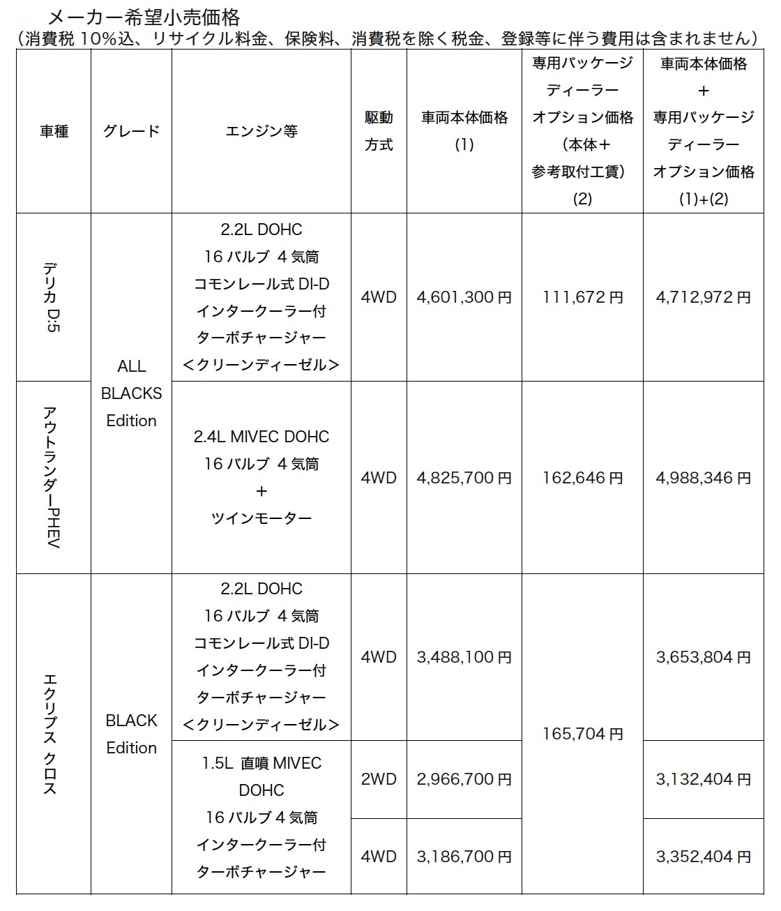車両本体価格・専用パッケージディーラーオプション価格