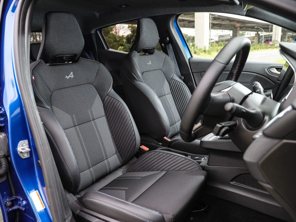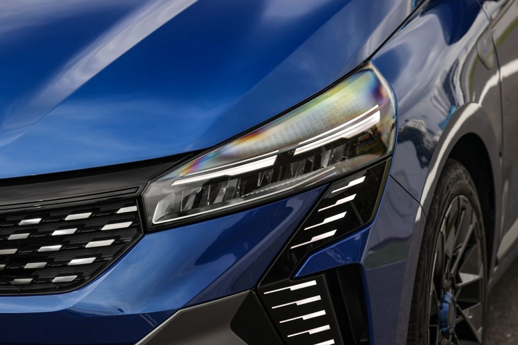 スポーティーさが強調されたLEDヘッドランプと、色と形でグラデーションを施すことで疾走感を表現したグリル、ルノーのエンブレムであるロザンジュを分割し、反転させてデザイン化したデイライトラインニングランプ。そして下部にはF1ブレードを配するなどし、エスプリアルピーヌの名にふさわしい、スポーツシックな雰囲気にまとめられています。