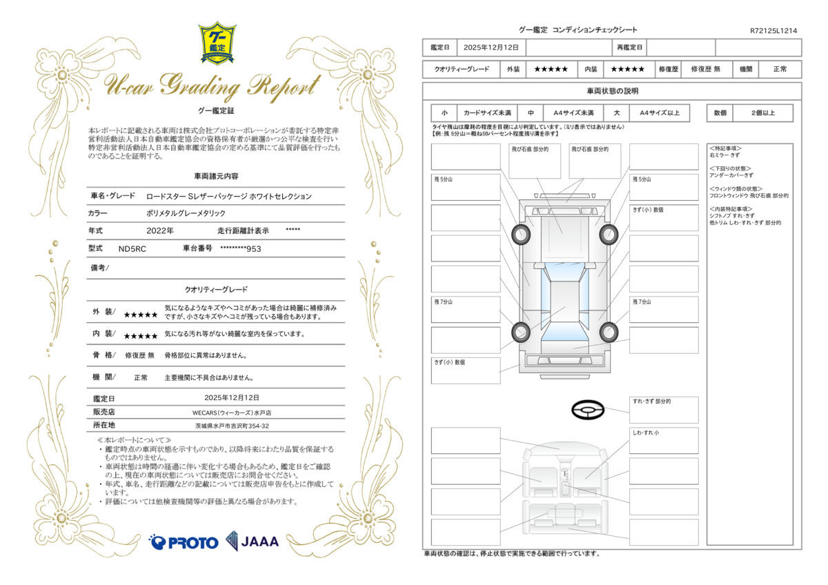 [保証付]:1ヶ月・1000km ※いずれか早い時期が保証適用の条件となります。 納車後1ヶ月・1000km以内は36機構・343項目を保証いたします。詳しくは販売店までお問い合わせ下さい。 |